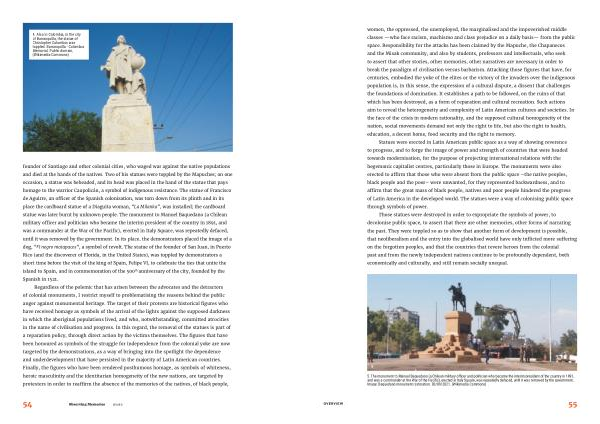 Regardless of the polemic that has arisen between the advocates and the detractors of colonial monuments , I restrict myself to problematising the reasons behind the public anger against monumental heritage . The target of their protests are historical figures who have received homage as symbols of the arrival of the lights against the supposed darkness in which the aboriginal populations lived , and who , notwithstanding , committed atrocities in the name of civilisation and progress . In this regard , the removal of the statues is part of a reparation policy , through direct action by the victims themselves . The figures that have been honoured as symbols of the struggle for independence from the colonial yoke are now targeted by the demonstrations , as a way of bringing into the spotlight the dependence and underdevelopment that have persisted in the majority of Latin American countries . Finally , the figures who have been rendered posthumous homage , as symbols of whiteness , heroic masculinity and the identitarian homogeneity of the new nations , are targeted by protesters in order to reaffirm the absence of the memories of the natives , of black people ,