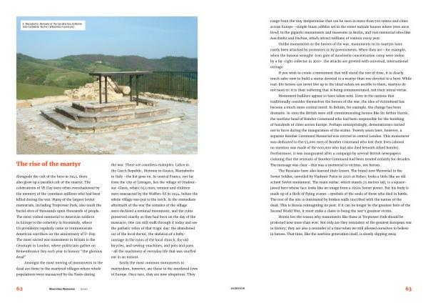 The Russians have also learned their lesson . The brand new Memorial to the Soviet Soldier , unveiled by Vladimir Putin in 2020 at Rzhev , looks a little like an old school Soviet monument . The main statue . which stands 25 metres tall , is a squarejawed hero whose face looks like an image from a 1950s Soviet poster . But his body is made up of a flock of flying cranes – symbols of the souls of those who died in battle . The rest of the site is dominated by broken walls inscribed with the names of the dead . This is Russia reimagining its past : if it can no longer be the greatest hero of the Second World War , it must stake a claim to being the war ’ s greatest victim .