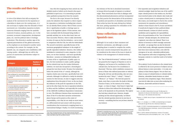 In view of the debates that will accompany the analysis of the movements for the reparation of colonialism in Spain over the coming years , it is also necessary to explain what the demands of these movements are . Colonialism reparation includes numerous demands ranging from the symbolic ( removal of statues , memory policies , etc .) to the economic ( economic compensation , development plans , etc .) and the political ( laws or heritage restitution ). This diversity is another sign of the regional particularities of this global movement , as the emphasis on one demand or another varies according to the context . For example , for the Spanish case , six categories were established , with varying results — although they are still in the process of construction and therefore subject to modification .