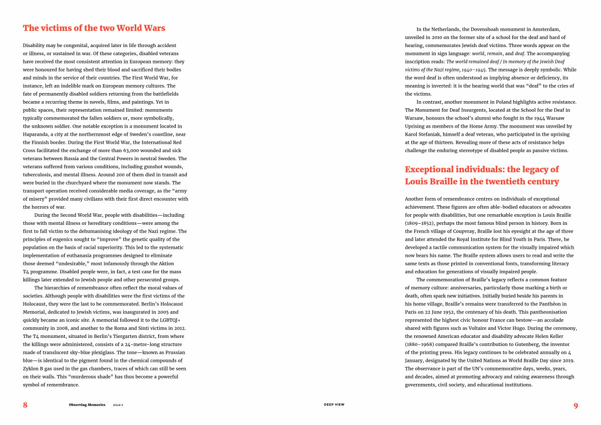 In contrast, another monument in Poland highlights active resistance. The Monument for Deaf Insurgents, located at the School for the Deaf in Warsaw, honours the school’ s alumni who fought in the 1944 Warsaw Uprising as members of the Home Army. The monument was unveiled by Karol Stefaniak, himself a deaf veteran, who participated in the uprising at the age of thirteen. Revealing more of these acts of resistance helps challenge the enduring stereotype of disabled people as passive victims.