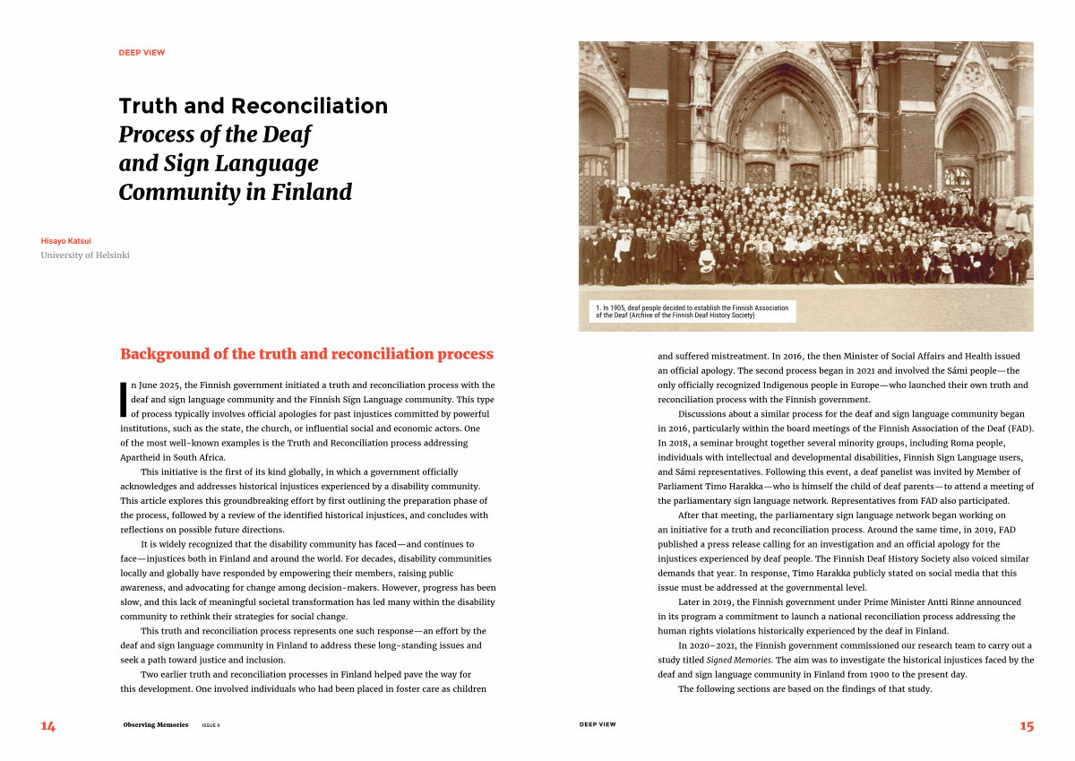 Later in 2019, the Finnish government under Prime Minister Antti Rinne announced in its program a commitment to launch a national reconciliation process addressing the human rights violations historically experienced by the deaf in Finland.