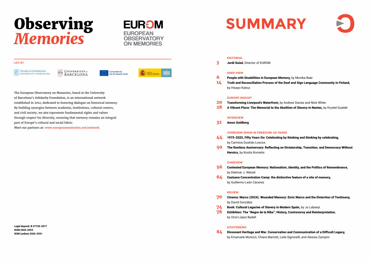 The European Observatory on Memories, based at the University of Barcelona’ s Solidarity Foundation, is an international network established in 2012, dedicated to fostering dialogue on historical memory. By building synergies between academia, institutions, cultural centers, and civil society, we aim topromote fundamental rights and values through respect for diversity, ensuring that memory remains an integral part of Europe’ s cultural and social fabric. Meet our partners at: www. europeanmemories. net / network