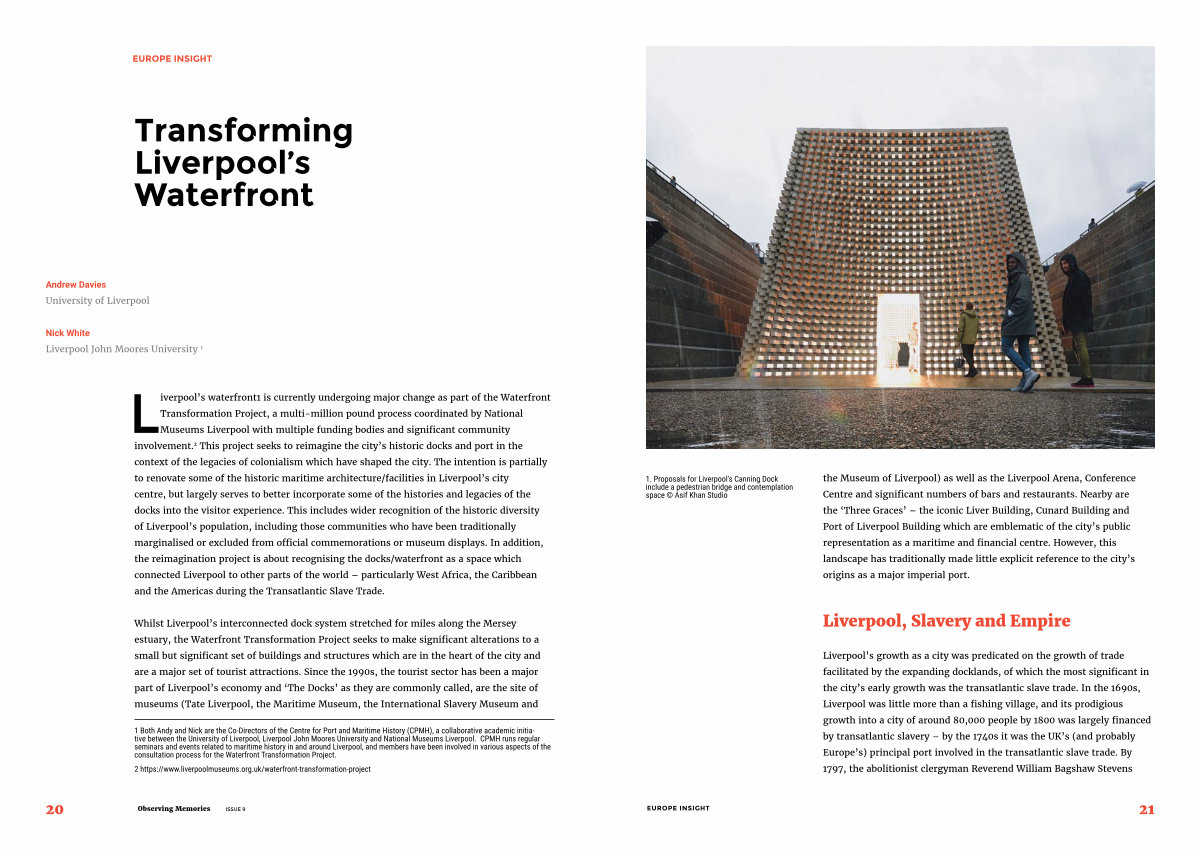 Liverpool’ s waterfront1 is currently undergoing major change as part of the Waterfront Transformation Project, a multi-million pound process coordinated by National Museums Liverpool with multiple funding bodies and significant community involvement. 2 This project seeks to reimagine the city’ s historic docks and port in the context of the legacies of colonialism which have shaped the city. The intention is partially to renovate some of the historic maritime architecture / facilities in Liverpool’ s city centre, but largely serves to better incorporate some of the histories and legacies of the docks into the visitor experience. This includes wider recognition of the historic diversity of Liverpool’ s population, including those communities who have been traditionally marginalised or excluded from official commemorations or museum displays. In addition, the reimagination project is about recognising the docks / waterfront as a space which connected Liverpool to other parts of the world – particularly West Africa, the Caribbean and the Americas during the Transatlantic Slave Trade.
