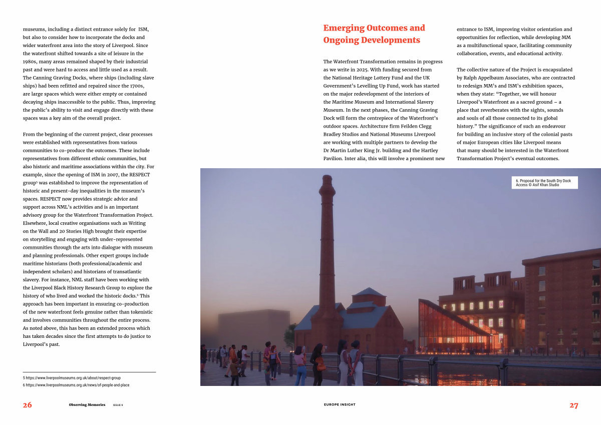 The Waterfront Transformation remains in progress as we write in 2025. With funding secured from the National Heritage Lottery Fund and the UK Government’ s Levelling Up Fund, work has started on the major redevelopment of the interiors of the Maritime Museum and International Slavery Museum. In the next phases, the Canning Graving Dock will form the centrepiece of the Waterfront’ s outdoor spaces. Architecture firm Feilden Clegg Bradley Studios and National Museums Liverpool are working with multiple partners to develop the Dr Martin Luther King Jr. building and the Hartley Pavilion. Inter alia, this will involve a prominent new entrance to ISM, improving visitor orientation and opportunities for reflection, while developing MM as a multifunctional space, facilitating community collaboration, events, and educational activity.