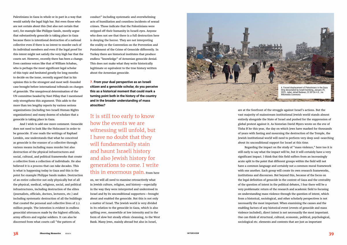 Regarding the impact on the study of " mass violence," here too it is still early to say what the impact will be, but it will certainly have a very significant impact. I think that this field suffers from an increasingly acute split to the point that different groups within the field will not have a common language and certainly not a common moral framework with one another. Each group will create its own research frameworks, institutions and discourses. But beyond this, because of the focus on the legal definition of genocide in the context of Gaza and the centrality of the question of intent in the political debates, I fear there will be a very problematic return of the research and academic field to focusing on understanding mass violence through the question of intent, which from a historical, sociological, and other scholarly perspectives is not necessarily the most important. When examining the causes and the enabling factors of any historical event( events of genocide and mass violence included), direct intent is not necessarily the most important. One can think of structural, cultural, economic, political, psychological, sociological etc. elements and contexts that are just as important