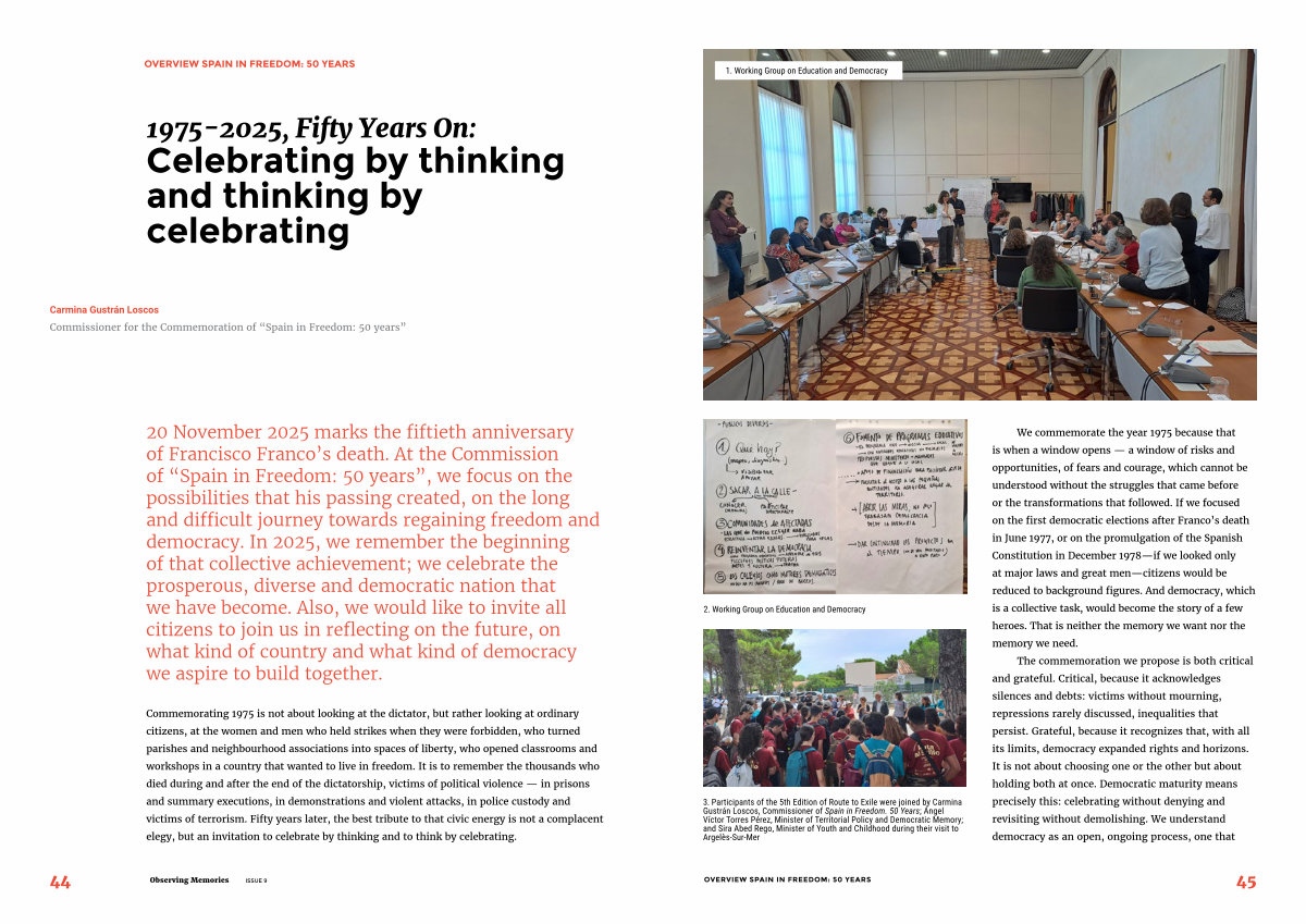 The commemoration we propose is both critical and grateful. Critical, because it acknowledges silences and debts: victims without mourning, repressions rarely discussed, inequalities that persist. Grateful, because it recognizes that, with all its limits, democracy expanded rights and horizons. It is not about choosing one or the other but about holding both at once. Democratic maturity means precisely this: celebrating without denying and revisiting without demolishing. We understand democracy as an open, ongoing process, one that overview SPAIN IN FREEDOM: 50 YEARS