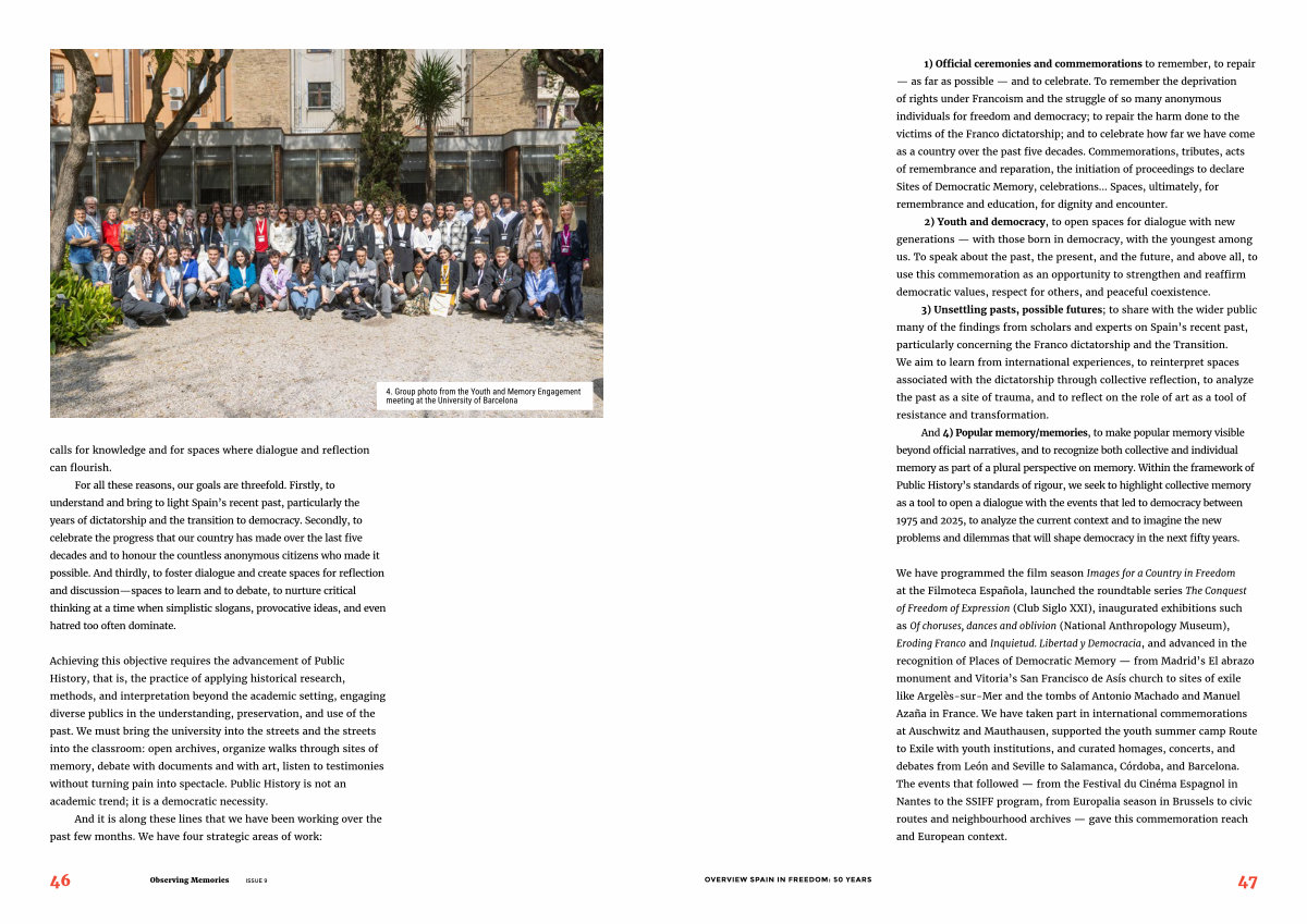 For all these reasons, our goals are threefold. Firstly, to understand and bring to light Spain’ s recent past, particularly the years of dictatorship and the transition to democracy. Secondly, to celebrate the progress that our country has made over the last five decades and to honour the countless anonymous citizens who made it possible. And thirdly, to foster dialogue and create spaces for reflection and discussion— spaces to learn and to debate, to nurture critical thinking at a time when simplistic slogans, provocative ideas, and even hatred too often dominate.