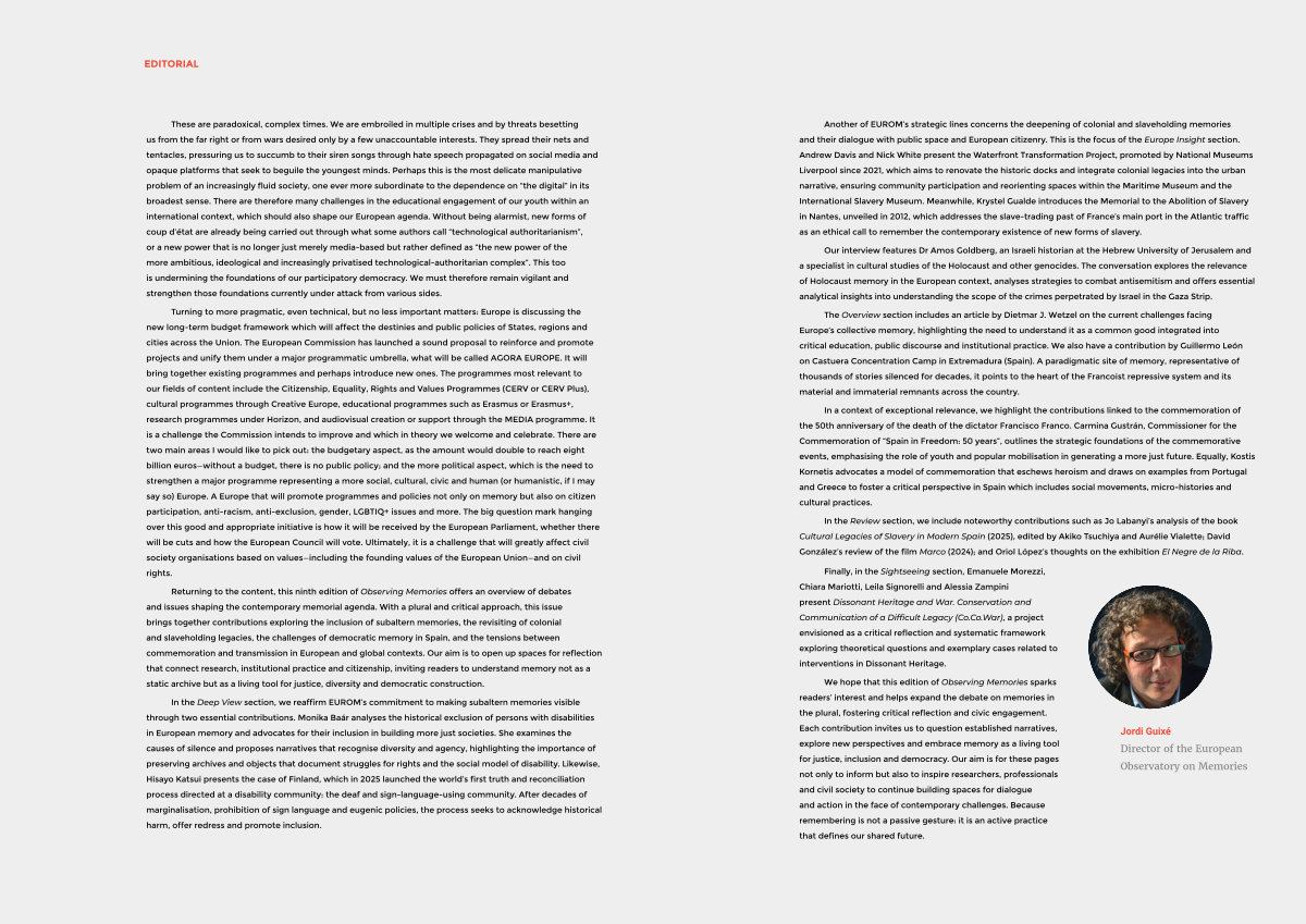 We hope that this edition of Observing Memories sparks readers’ interest and helps expand the debate on memories in the plural, fostering critical reflection and civic engagement. Each contribution invites us to question established narratives, explore new perspectives and embrace memory as a living tool for justice, inclusion and democracy. Our aim is for these pages not only to inform but also to inspire researchers, professionals and civil society to continue building spaces for dialogue and action in the face of contemporary challenges. Because remembering is not a passive gesture: it is an active practice that defines our shared future.