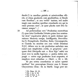 (!), quae inter Cardinales Virtutes primo loco nominatur sicut 6 requiruntur plures ex parte Animae operationes Memoria nempe , Intelligentia , Prowidentia (!), Promptitudo , Docilitas , Ratio , Circumspectio , et Cautela ita monitos nos esse voluit Dominus