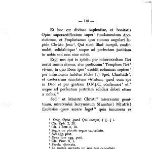 — 112 — Et hoc est divinae sapientiae , et bonitatis Opus , superaedificatum super1 fundamentum Apostolorum , et Prophetarum ipso summo angulari lapide Christo Jesu2 , Qui sicut illud incepit , confirmabit , solidabitque 3 usque ad perfectam justitiam in nobis sed non sine nobis .