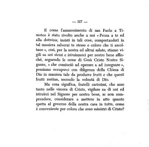 E come l ’ ammonimento di san Paolo a Timoteo è stato rivolto anche a noi « Pensa a te ed alla dottrina ; insisti in tali cose ; comportandoti in tal maniera salverai te stesso e coloro che ti ascoltano », così , per la nostra ed altrui salute , stiamo vigili su noi stessi e istruiamoci per nostro bene affinché , seguendo le orme di Gesù Cristo Nostro Signore , « che cominciò ad operare a ad insegnare », possiamo occuparci con diligenza della Chiesa di