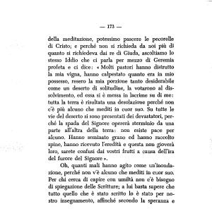 della meditazione , potessimo pascere le pecorelle di Cristo ; e perché non si richieda da noi più di quanto si richiedeva dai re di Giuda , ascoltiamo lo stesso Iddio che ci parla per mezzo di Geremia profeta e ci dice : « Molti pastori hanno distrutto la mia vigna , hanno calpestato quanto era in mio possesso , resero la mia porzione tanto desiderabile come un deserto di solitudine , la votarono al dissolvimento , ed essa si è messa in lacrime su di me : tutta la terra è risultata una desolazione perché non c ’ è più alcuno che mediti in cuor suo . Su tutte le vie del deserto si sono presentati dei devastatori , perché la spada del Signore opererà sterminio da ima parte all ’ altra della terra : non esiste pace per alcuno . Hanno seminato grano ed hanno raccolto spine , hanno ricevuto l ’ eredità e questa non gioverà loro , sarete confusi dai vostri frutti a causa dell ’ ira del furore del Signore ».