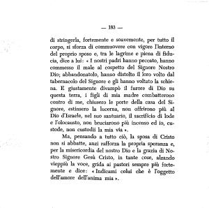di stringerla , fortemente e soavemente , per tutto il corpo , si sforza di commuovere con vigore l ’ interno del proprio sposo e , tra le lagrime e piena di fiducia , dice a lui : « I nostri padri hanno peccato , hanno commesso il male al cospetto del Signore Nostro Dio ; abbandonatolo , hanno distolto il loro volto dal tabernacolo del Signore e gli hanno voltato la schiena . E giustamente divampò il furore di Dio su questa terra , i figli di mia madre combatterono contro di me , chiusero le porte della casa del Signore , estinsero la lucerna , non offrirono più al