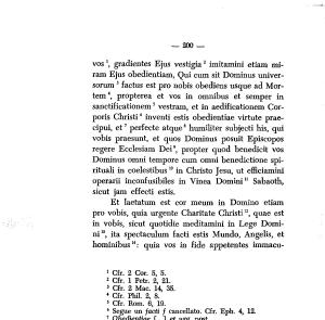 vos \ gradientes Ejus vestigia2 imitamini etiam miram Ejus obedientiam , Qui cum sit Dominus universorum3 factus est prò nobis obediens usque ad Mortem4 , propterea et vos in omnibus et semper in sanctificationem5 vestram , et in aedificationem Corporis Christi6 inventi estis obedientiae virtute praecipui , et7 perfecte atque8 humiliter subjecti his , qui vobis praesunt , et quos Dominus posuit Episcopos regere Ecclesiam Dei9 , propter quod benedicit vos