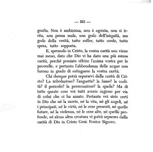 Chi dunque potrà separarvi dalla carità di Cristo ? La tribolazione ? l ’ angustia ? la fame ? la nudità ? il pericolo ? la persecuzione ? la spada ? Ma di tutte queste cose voi tutti avrete ragione per via di colui che ci ha amato . Pertanto voi siete certi in Dio che né la morte , né la vita , né gli angeli , né i principati , né le virtù , né le cose presenti , né quelle future , né la violenza , né le cose alte , né quelle profonde , né alcun altra creatura vi potrà separare dalla carità di Dio in Cristo Gesù Nostro Signore .