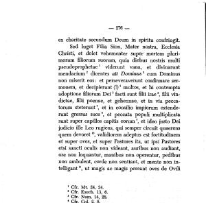 Sed luget Filia Sion , Mater nostra , Ecclesia Christi , et dolet vehementer super mortem plurimorum filiorum suorum , quia diebus nostris multi pseudoprophetae1 viderunt vana , et divinarunt mendacium12 dicentes ait Dominus3 cum Dominus non miserit eos : et perseveraverunt confìrmare sermonem , et decipierunt (!) 4 multos , et hi contempla adoptione filiorum Dei5 facti sunt filii irae6 , fìlii vindictae , fìlii poenae , et gehennae , et in via peccatorum steterunt7 , et in consilio impiorum extenderunt gressus suos8 9 , et peccata populi multiplicata sunt super capillos capitis eorums , et ideo justo Dei judicio file Leo rugiens , qui semper circuii quaerens quem devoret10 11 , validiorem adeptus est fortitudinem et super oves , et super Pastores ita , ut ipsi Pastores etsi sancti oculis non videant , auribus non audiant , ore non loquantur , manibus non operentur , pedibus non ambulent , corde non sentiant , et mente non intelligantu , ut magis ac magis pereant oves de Ovili