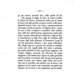 Ma piange la figlia di Sion , la nostra madre , la Chiesa di Cristo e fortemente soffre per la morte di tanti suoi figli perché , ai giorni nostri , molti pseudoprofeti hanno visto cose vane e preannunziarono menzogne usando le parole « il Signore dice » quando non è stato il Signore a mandarli . Essi insistettero nelle loro affermazioni , ingannarono tanti individui e questi , abbandonata l ’ adozione a figli di Dio , si tramutarono in figli d ’ ira , figli di vendetta , figli di pena , figli della gehenna . Si fermarono lungo la via dei peccatori , estesero i loro passi nell ’ assemblea degli empi ed i peccati dei popoli si moltiplicarono più dei capelli delle loro teste e pertanto , per giusto giudizio di Dio , quel leone ruggente , che sempre s ’ aggira cercando chi divorare , ha preso maggiore e più baldanzoso vigore sia sulle pecorelle che sui pastori , in maniera tale che gli stessi pastori , anche se santi , non vedano cogli occhi , non ascoltino con le orecchie , non parlino con la bocca , non agiscano con le mani , non camminino coi piedi non sentano con il cuore e non capiscano con la mente .