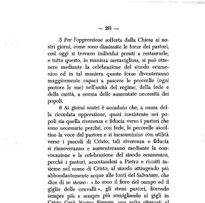 6 Ai giorni nostri è accaduto che , a causa della ricordata oppressione , quasi inesistente nei popoli sia quella riverenza e fiducia verso i pastori che sono necessarie perché , con fede , le pecorelle ascoltino la voce del pastore e si incamminino con utilità verso i pascoli di Cristo ; tali riverenza e fiducia si rinnoveranno e aumenteranno mediante la convocazione e la celebrazione del sinodo ecumenico , perché i pastori , accostandosi a Pietro e riuniti insieme nel nome di Cristo , al sinodo attingendo più abbondantemente acque alle fonti del Salvatore , che dice di se stesso : « Io sono il fiore del campo ed il giglio delle convalli », gli stessi pastori , fiorendo sempre più e sempre più somigliando ai gigli in