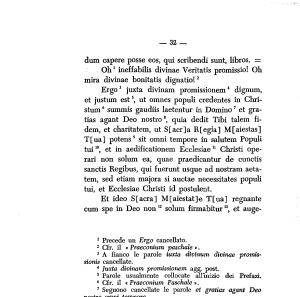 Ergo3 juxta divinanti promissionem4 dignum , et justum est5 , ut omnes populi credentes in Christum 6 summis gaudiis laetentur in Domino7 et gratias agant Deo nostro 8 , quia dedit Tibi talem fidem , et charitatem , ut S [ acr ] a Rfegia ] M [ aiestas ] T [ ua ] potens9 sit omni tempore in salutem Populi tui10 , et in aedificationem Ecclesiae11 Christi operali non solum ea , quae praedicantur de cunctis sanctis Regibus , qui fuerunt usque ad nostram aetatem , sed etiam majora si auctae necessitate » populi tui , et Ecclesiae Christi id postulerai .
