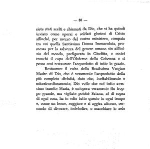 siete stati scelti e chiamati da Dio , che vi ha quindi inviato come operai e soldati gloriosi di Cristo affinché , per mezzo del vostro ministero , compaia tra voi quella Santissima Donna Immacolata , promessa per la salvezza del genere umano sin all ’ inizio del mondo , prefigurata in Giuditta , e costei tronchi il capo dell ’ Oloferne della Gehenna e si possa così restaurare l ’ acquedotto di tutte le grazie .