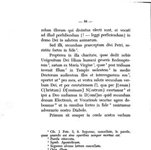 Doctorum audientem illos et interrogantem eos7 , oportet ut8 prò mea , et vestra salute secundum verbum Dei , et per esortationem (!), qua per Jfesum ] C [ hristum ] D [ ominum ] N [ ostrum ] esortamur9 et ipsi a Deo audiamus in D [ orni ] no quid secundum donum Electionis , et Vocationis sanctae agere debeamus 10 11ut in omnibus fortes in fide 11 resistamus adversario nostro Diabolo .
