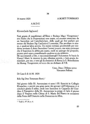 Nel giorno della SS . Annunziata vi sono i SS . Esercizi in Collegio R [ oma ] no , e perciò una gran parte dei giovani dell ’ Adunanza vi si conduce giusta il solito , onde non facendosi in Cappella del Giardino il Panegirico della SS . Annunziata la prego di farlo il giorno dopo il Vespero nella Chiesa di S . Maria del Pianto in occasione della Festa dell ’ Oratorio nella Domenica in Albis . i