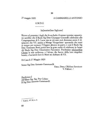 Ricevo al presente i fogli che le accludo : il mezzo termine opportuno sarebbe che il Rndo Sig Don Giuseppe Gonnelli celebrasse alla Congregazione di S . Luca : ma se ciò non può dovremo avere il dispiacere che V . S . assista a Mongr Vicegerente1 sperando che torni in tempo per suonare l ’ Organo almeno in parte ; e così il Rndo Sig