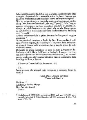 Non ho tempo di scrivere particolarmente , ma faccia grazia di dire al Sig Don Antonio Gammarelli , che se gl ’ Operaj (!) della Congregazione convengono , sarebbe opportuno condurre i Giovani a S . Giorgio , e poi al divertimento nei giorni , che vaca la Congregazione in Ottobre : se è necessario conviene renderne inteso il Rndo Sig Aw : Ferrarelli . 3