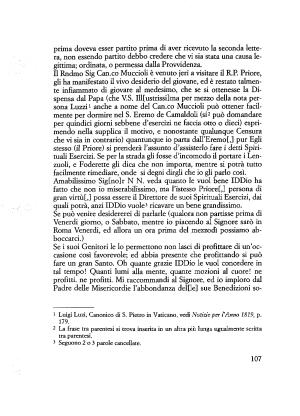 D Rndmo Sig Can . co Muccioli è venuto jeri a visitare il R . P . Priore , gli ha manifestato il vivo desiderio del giovane , ed è restato talmente infiammato di giovare al medesimo , che se si ottenesse la Dispensa dal Papa ( che V . S . Ill [ ustrissi ] ma per mezzo della nota persona Luzzi1 anche a nome del Can . co Muccioli può ottener facilmente per dormire nel S . Eremo de Camaldoli ( si12 può domandare per quindici giorni sebbene d ’ esercizi ne faccia otto o dieci ) esprimendo nella supplica il motivo , e nonostante qualunque Censura che vi sia in contrario ) quantunque io parta dall ’ Eremof ,] pur Egli stesso ( il Priore ) si prenderà l ’ assunto d ’ assisterlo fare i detti Spirituali Esercizi . Se per la strada gli fosse d ’ incomodo il portare i Lenzuola e Foderette gli dica che non importa , mentre si potrà tutto facilmente rimediare , onde si degni dirgli che io gli parlo così .