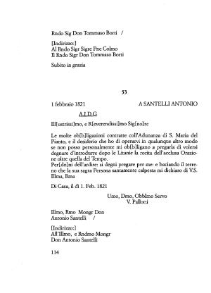 Le molte ob [ b ] ligazioni contratte Coll ’ Adunanza di S . Maria del Pianto , e il desiderio che ho di operarvi in qualunque altro modo se non posso personalmente mi ob [ b ] ligano a pregarla di volersi degnare d ’ introdurre dopo le Litanie la recita dell ’ acclusa Orazione oltre quella del Tempo . Per [ do ] ni dell ’ ardire : si degni pregare per me : e baciando il terreno che la sua sagra Persona santamente calpesta mi dichiaro di V . S . Illma , Rma