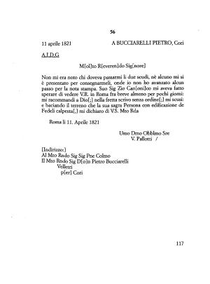 Non mi era noto chi doveva passarmi li due scudi , nè alcuno mi si è presentato per consegnarmeli , onde io non ho avanzato alcun passo per la nota stampa . Suo Sig Zio Cantoni ] co mi aveva fatto sperare di vedere V . R . in Roma fra breve almeno per pochi giorni : mi racommandi a Dio [;] nella fretta scrivo senza ordinef ;] mi scusi : e baciando il terreno che la sua sagra Persona con edificazione de