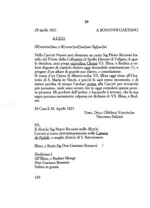 Nelle Carceri Nuove avvi detenuto un certo Sig Pietro Riccioni fratello del Priore della Collegiata di Spello Diocesi di Fuligno , il quale desidera , anzi prega visceribus Christi V . S . Illma , e Rndtna a volersi degnare di visitarlo dentro oggi dovendole communicare (!), e pregare d ’ un affare di grande suo rilievo , e consolazione .