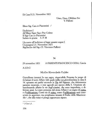 [ Accanto all ’ indirizzo si legge quanto segue :] Ctonsegna ] 21 . Novembre 1821 Big [ liet ] to del Sig . r D . Vincenzo Pallotti
