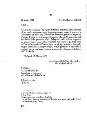 Vicolo del Bollo prossimo alle (!) Pellegrino , nella ritirata in portone grande tinto rosso senza Numero ma sopra il portone avvi un ’ immagine + primo Piano + 4 per carità non manchi , e l ’ attende magno animi ardore . Preghi preghi , preghi p [ er ] me e baciando il terreno , che la sua sagra persona santamente calpesta mi dichiaro di V . Ptà Rnda