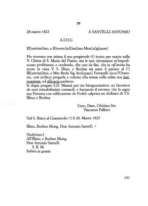 Dal S . Ritiro al Giannicolo (!) li 28 . Marzo 1822 Hhno , Rndmo Mong . Don Antonio Santelli /