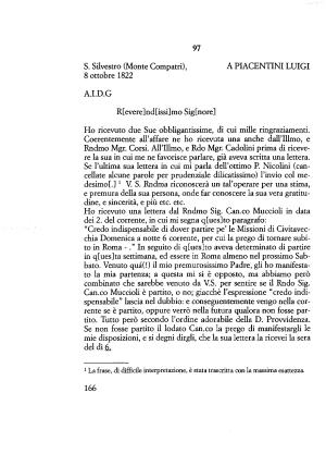 “ Credo indispensabile di dover partire pe ’ le Missioni di Civitavecchia Domenica a notte 6 corrente , per cui la prego di tornare subito in Roma - .” In seguito di q [ ues ] to aveva determinato di partire in q [ ues ] ta settimana , ed essere in Roma almeno nel prossimo Sabbato . Venuto quà (!) il mio premurosissimo Padre , gli ho manifestato la mia partenza ; a questa mi si è opposto , ma abbiamo però combinato che sarebbe venuto da V . S . per sentire se il Rndo Sig . Can . co Muccioli è partito , o no ; giacché l ’ espressione “ credo indispensabile ” lascia nel dubbio : e conseguentemente vengo nella corrente se è partito , oppure verrò nella futura qualora non fosse partito . Tutto però secondo l ’ ordine adorabile della D . Provvidenza .