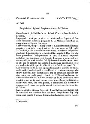 Debbo credere , che pe ’ i miei peccati V . S . si sia trovata nella indisposizione onde io le comunicassi un tale lume avuto su di lei nella S . Orazione , e che io non le ho comunicato . Adoriamo nel profondo abisso di nostra miseria la infinita Misericordia di Dio , che sebbene prevedesse l ’ indisposizione in uno , il silenzio colpevole nell ’ altro , cioè in me , pure si è degnato illuminare la mente del peccatore , e ciò per suoi altissimi fini . Qui osserviamo che questo istesso che ora ho esposto può essere di particolare giovamento e per me , onde mi umilii , e per lei affinchè non si fidi di me , ma di Dio .