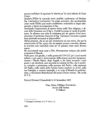 Qualora IDDio le conceda avere qualche conferenza col Rndmo Sig . Cantoni ] co Lor [ enzi ] ni2 la prego avvertire , che ascoltandolo come vuole IDDio può molto profittarne ; vedendolo si degni salutarmelo , e farmi raccomandare a Dio . Dandosele l ’ opportunità di tenere fermo nella Vita religiosa , e divota delle Quaranta ore il Sig L . Gentili la prego in carità di profittarne . Se almeno una volta la settimana per un quarto d ’ ora incominciasse il medesimo Esercizio il Sig . Tommaso Cuccioni a quanti beni spirituali necessarii si disporrebbe !