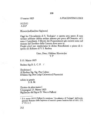 1 H 4 . marzo 1819 il Pallotti fu nominato “ Accademico di Teologia ” dell ’ Archiginnasio Romano della Sapienza ed esercitò questa funzione fino al 1831 . Cf . l . n ° 14 e n . 2 .