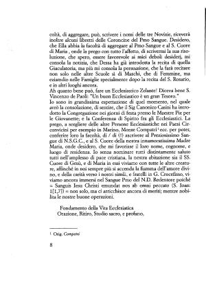 Io sono in grandissima espettazione di quel momento , nel quale avrò la consolazione , di sentire , che il Sig Canonico Casini ha introdotto la Congregazione nei giorni di festa presso le Maestre Pie per le Giovanette ; e la Conferenza di Spirito fra gli Ecclesiastici . La prego , a scegliere delle altre Persone Ecclesiastiche nei Paesi Circonvicini per esempio in Marino , Monte Compatri1 ecc . per poter , conferire loro la facoltà , di / di (!) ascrivere al Preziosissimo Sangue di N . S . G . C ., e al S . Cuore della nostra innamoratissima Madre