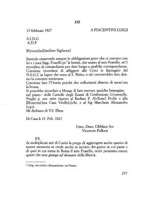 Ai moltiplicati atti di Carità la prego di aggiungere anche questo di tenere memoria se crede anche in iscritto dei giorni in cui parte e di quei in cui torna in Roma il mio Fratello , onde possiamo essere quieti che non giunga ad abusarsi della libertà .