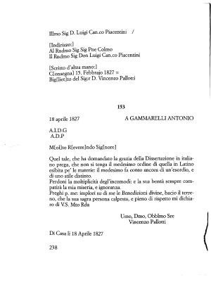 [ Scritto d ’ altra mano :] Ctonsegna ] 15 . Febbrajo 1827 = Big [ liet ] to del Sig : r D . Vincenzo Pallotti
