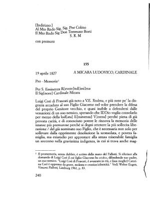 1 II promemoria , senza dubbio , è scritto dalla mano del Pallotti . Si riferisce alla domanda di Luigi Cori il cui figlio Giacomo ha ucciso , difendendo suo padre , un suo nemico . “ Luigi Cori di Frascati , è avanzato in età , e [ sua moglie ] Caterina Cori è oppressa da grave , molesta e cronica infermità .” Vedi Weber Eugen ,