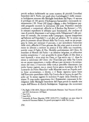 perciò ardisco indirizzarle un certo numero di piccioli Crocefìssi benedetti dal S . Padre , nei quali oltre il privileggio ( l ) delle consuete Indulgenze annesso alle Medaglie benedette dal Papa , v ’ è ancora il privilegio di 100 giorni d ’ indulgenza baciandoli e invocando insiememente i SS . Nomi [ di ] Gesù e Maria , e altre Indulgenze parziali pregando secondo la intenzione del som : Pontefice essendo confessati , e comunicati ; affinchè se il Rndmo Sig Rettore2 , e V . S . lo stimano espediente le abbiano quei Seminaristi , che credono al caso di poterle dispensare o nel tempo della Villegiatura (!) alle persone di contado , che trovano nelle Campagne , oppure inappresso agl ’ infermi nel ’ Ospedale ( i ) o ad altri ad arbitrio . Pe ’ lo stesso oggetto le presento alcuni libretti della Via Crucis , onde ne sia propagata la visita per estirpare il peccato , e per introdurre l ’ esercizio delle virtù , affinchè il Clero giovane fin dai primi anni si avvezzi almeno in silenzio a mettere in pratica il fine della sua vocazione , poiché come il Figlio di Dio , Modello perfettissimo del Clero , fù mandato al Mondo dal Padre = ut deleatur iniquitas , et adducatur justitia sempiterna = 3 così q [ uan ] do lo stesso Figlio di Dio disse a suoi Apostoli - sicut misit me Pater , et Ego mitto vos = 4 disse lo stesso a cia [ s ] cuno del Clero : che l ’ Esercizio poi della Via Crucis sia un mezzo opportuno , e molto efficace per ottenere e la estirpazione del vizio , e l ’ esercizio della virtù , si potrebbe dimostrare con molte buone ragioni , ma p . essere breve giova ricordarsi che il B .