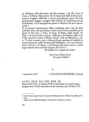 ne utilissima della Divozione del Pmo Sangue , e dei SS . Cuori di Gesù , e di Maria . Ella sa bene che le Opere più belle di Dio incontrano le maggiori difficoltà , e perciò grandemente spero che loro prenderanno maggior coraggio nello stabilire la Conferenza per gli Ecclesiastici , e la Congregazione presso le Maestre Pie per le giovanettef .]