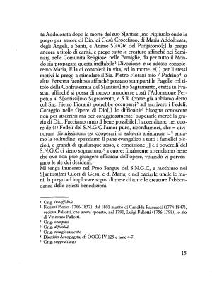 ta Addolorata dopo la morte del suo S [ antissi ] mo Figliuolo onde la prego per amore di Dio , di Gesù Crocefisso , di Maria Addolorata , degli Angeli , e Santi , e Anime S [ an ] te del Purgatorio [;] la prego ancora a titolo di carità , e prego tutte le creature affinché nei Seminar ], nelle Comunità Religiose , nelle Famiglie , da per tutto il Mondo sia propagata questa ineffabile345 Divozione ; e se adesso consoleremo Maria , Ella ci consolerà in vita , ed in morte . e ( ! ) per li stessi motivi la prego a stimolare il Sig . Pietro Fiorani mio / Padrino4 , o altra Persona facoltosa affinché possano stamparsi le Pagelle col titolo della Confraternita del S [ antissi ] mo Sagramento , eretta in Frascati affinché si possa di nuovo introdurre costì l ’ Adorazione Perpetua al Stantissimo Sagramento , e S . R . ( come già abbiamo detto col Sig . Pietro Fiorani ) potrebbe occuparsi5 ad ascrivere i Fedeli .