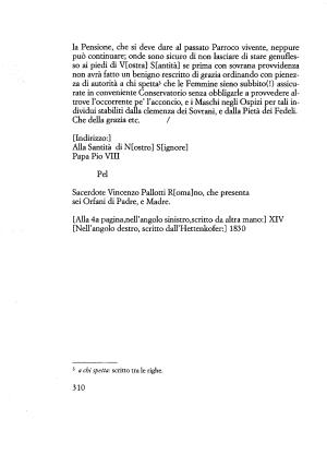 la Pensione , che si deve dare al passato Parroco vivente , neppure può continuare ; onde sono sicuro di non lasciare di stare genuflesso ai piedi di V [ ostra ] S [ antità ] se prima con sovrana provvidenza non avrà fatto un benigno rescritto di grazia ordinando con pienezza di autorità a chi spetta3 che le Femmine sieno subbito (!) assicurate in conveniente Conservatorio senza obbligarle a provvedere altrove l ’ occorrente pe ’ l ’ acconcio , e i Maschi negli Ospizi per tali individui stabiliti dalla clemenza dei Sovrani , e dalla Pietà dei Fedeli .
