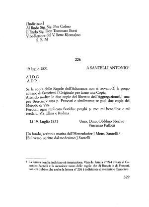 1 La lettera non ha indirizzo nè intestazione . Vista la lettera n “ 224 inviata al Canonico Santelli e la menzione tanto delle regole che di Brescia e di Frascati , non c ’ è dubbio che anche la lettera n ° 226 è indirizzata al medesimo Canonico .