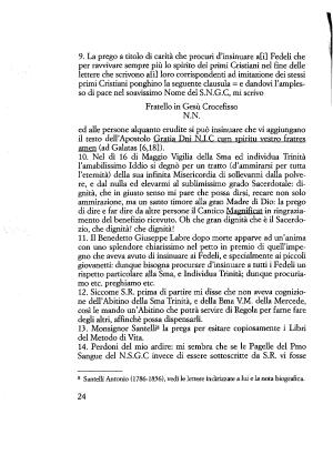 ed alle persone alquanto erudite si può insinuare che vi aggiungano il testo dell ’ Apostolo Grafia Dni N . I . C cum spiritu vestro fratres amen ( ad Galatas [ 6,18 ]). 10 . Nel dì 16 di Maggio Vigilia della Sma ed individua Trinità l ’ amabilissimo Iddio si degnò per un tratto ( d ’ ammirarsi per tutta l ’ eternità ) della sua infinita Misericordia di sollevarmi dalla polvere , e dal nulla ed elevarmi al sublimissimo grado Sacerdotale : dignità , che in giusto senso mi pare che possa dirsi , recare non solo ammirazione , ma un santo timore alla gran Madre di Dio : la prego di dire e far dire da altre persone il Cantico Magnificat in ringraziamento del benefizio ricevuto . Oh che gran dignità che è il Sacerdozio , che dignità ! che dignità ! 11 . Il Benedetto Giuseppe Labre dopo morte apparve ad un ’ anima con uno splendore chiarissimo nel petto in premio di quell ’ impegno che aveva avuto di insinuare ai Fedeli , e specialmente ai piccoli giovanetti : dunque bisogna procurare d ’ insinuare a tutti i Fedeli un rispetto particolare alla Sma , e Individua Trinità ; dunque procuriamo etc . preghiamo etc .
