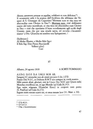 E veramente utile è la pratica dell ’ Antifona che abbiamo dei Vesperi di S . Giuseppe da Cupertino :” Mortuus sum et vita mea est abscondita cum Christo in Deo ” 6 . Mortuus sum . cioè dobbiamo essere del tutto mortificati , et vita mea est abscondita cum Christo in Deo = cioè che operiamo il bene occultamente agli occhi degli Uomini , ossia che per una strada santa , ed occulta c ’ incamminiamo7 a Dio . Q [ ues ] ta mi sembra una Spiegazione . /